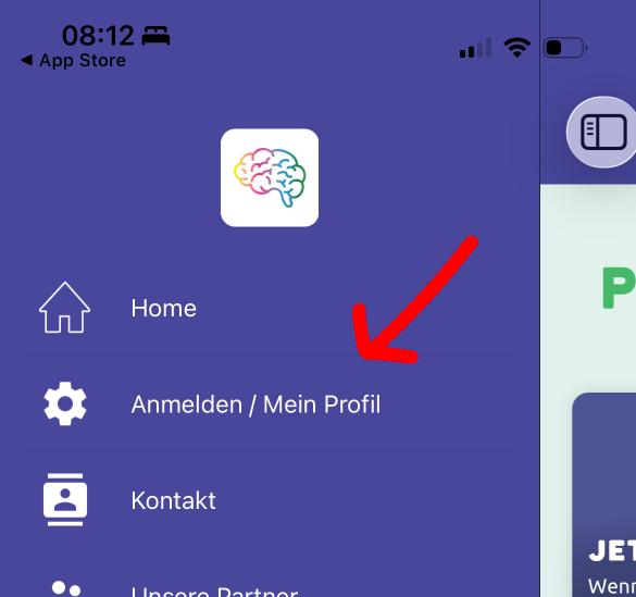 💡 Zum Anmeldung in der APP bitte auf »Anmelden / Mein Profil« im Menu oben links klicken.