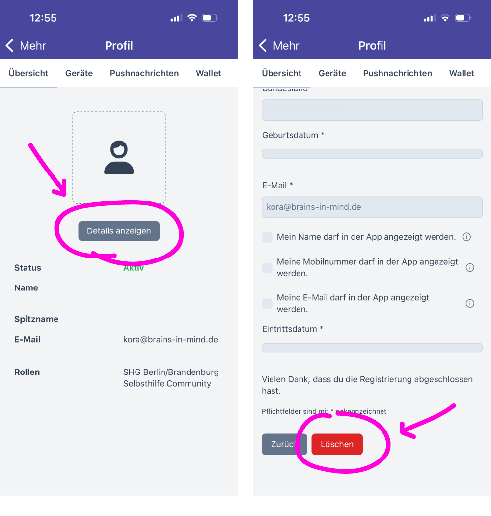 💡 Die Registrierung in der App ist ohne Zeitlimit. Lediglich das Add-On PLUS gilt für 12 Monate. Wir informieren dich rechtzeitig, wann und ob du das Add-On durch einen erneute Kauf verlängern möchtest. Wenn dies nicht geschieht, wird diese Bereich für dich nach den12 Monaten gesperrt. Möchtest du die PDA Initiative verlassen inkl. Löschung deiner Daten aus dem CMS, dann klicke unter »Anmelden / Mein Profil« im Menu auf »Details anzeigen«. Auf der folgenden Seite kannst du ganz unten auf »Löschen« klicken. Damit werden deine Daten aus dem Content Management System der App gelöscht.