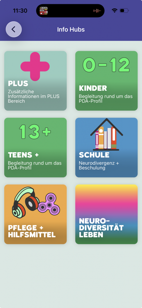 Ein weiterer großer Vorteil unserer App ist die Vielzahl an In-App-Funktionen, die zentral über die Startseite Home für alle registrierten Nutzer:innen erreichbar sind. Dazu gehören unter anderem zusätzliche Informationsangebote wie Was ist PDA, ein Glossar mit den wichtigsten Begriffen im Kontext von Neurodiversität, Info-Hubs, mit gebündelten relevante Informationen, ein Veranstaltungskalender sowie eine umfangreiche Linksammlung.