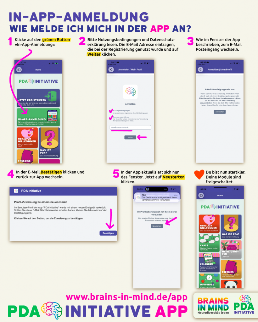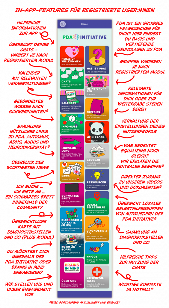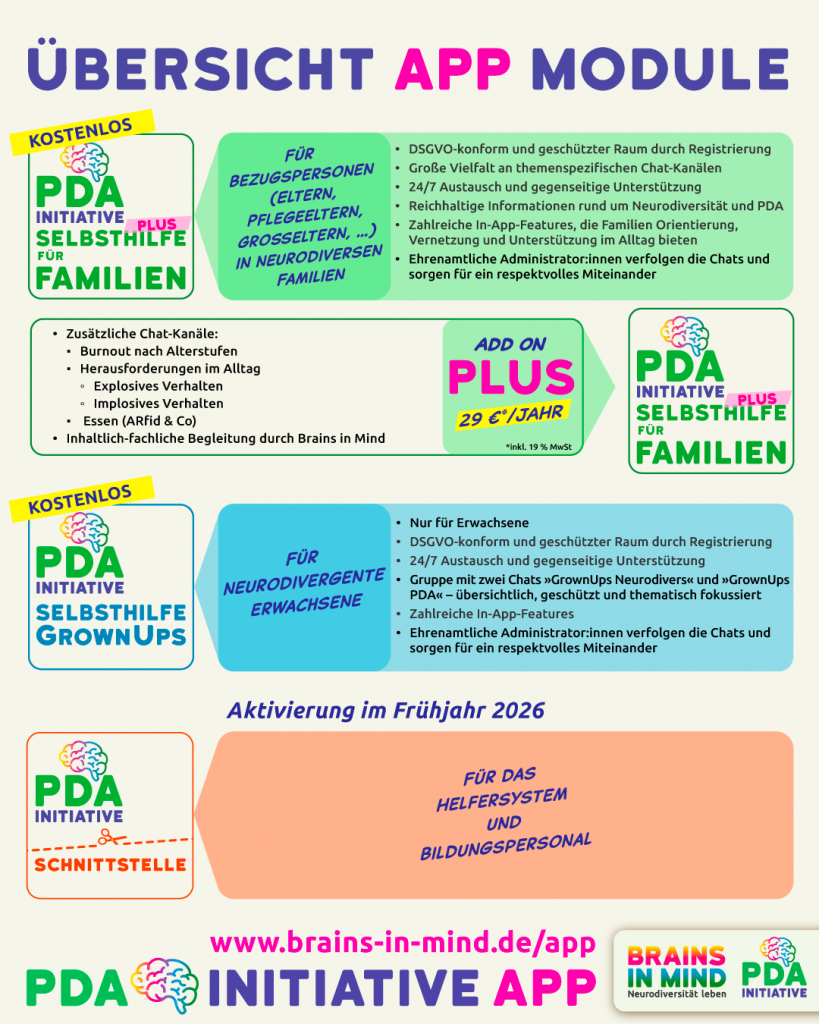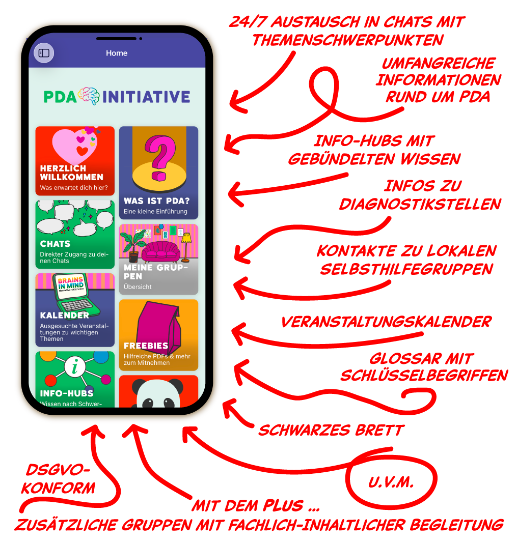 Wir sind sehr stolz darauf, mit der eigens für die PDA Initiative entwickelten, DSGVO-konformen App an den Start zu gehen. Sie ist die zentrale Selbsthilfe-Plattform für 24/7-Informationen, Austausch und Unterstützung rund um Neurodiversität mit dem Schwerpunkt PDA.