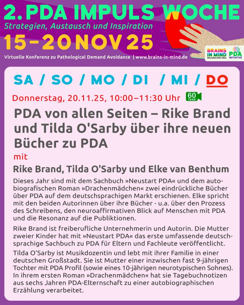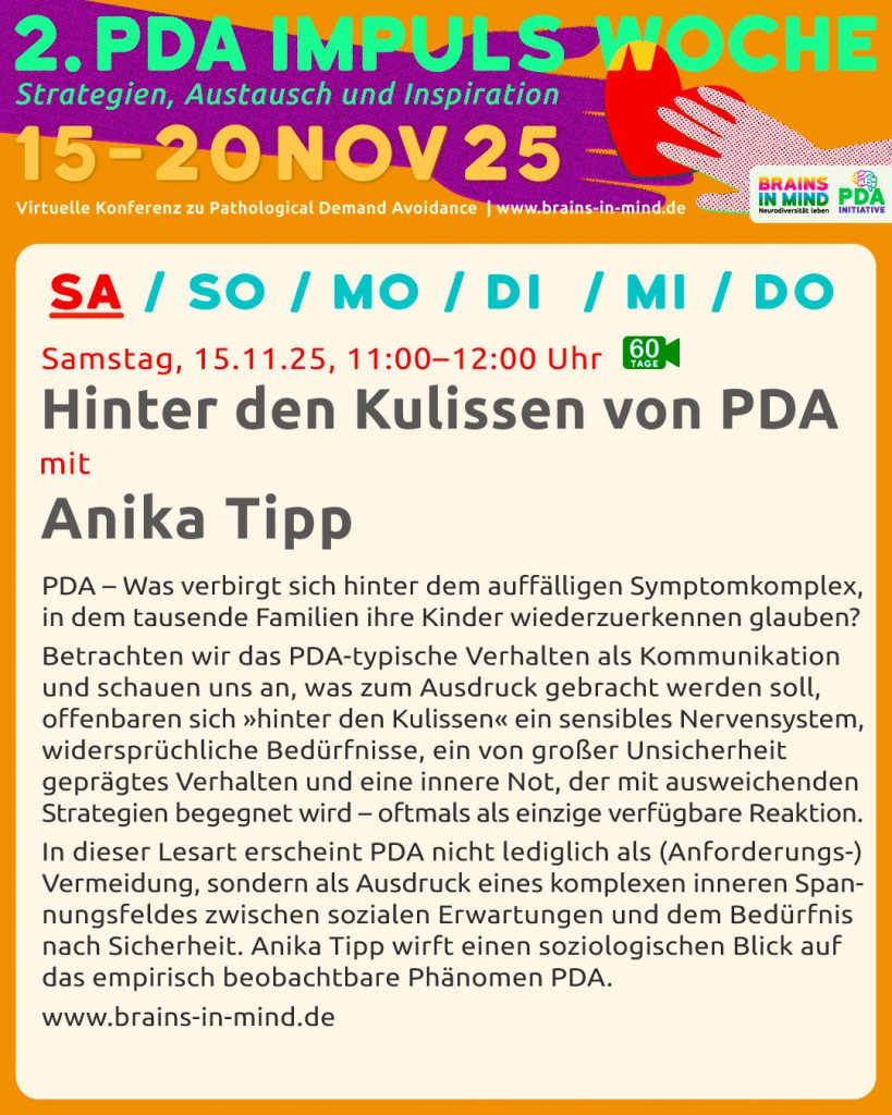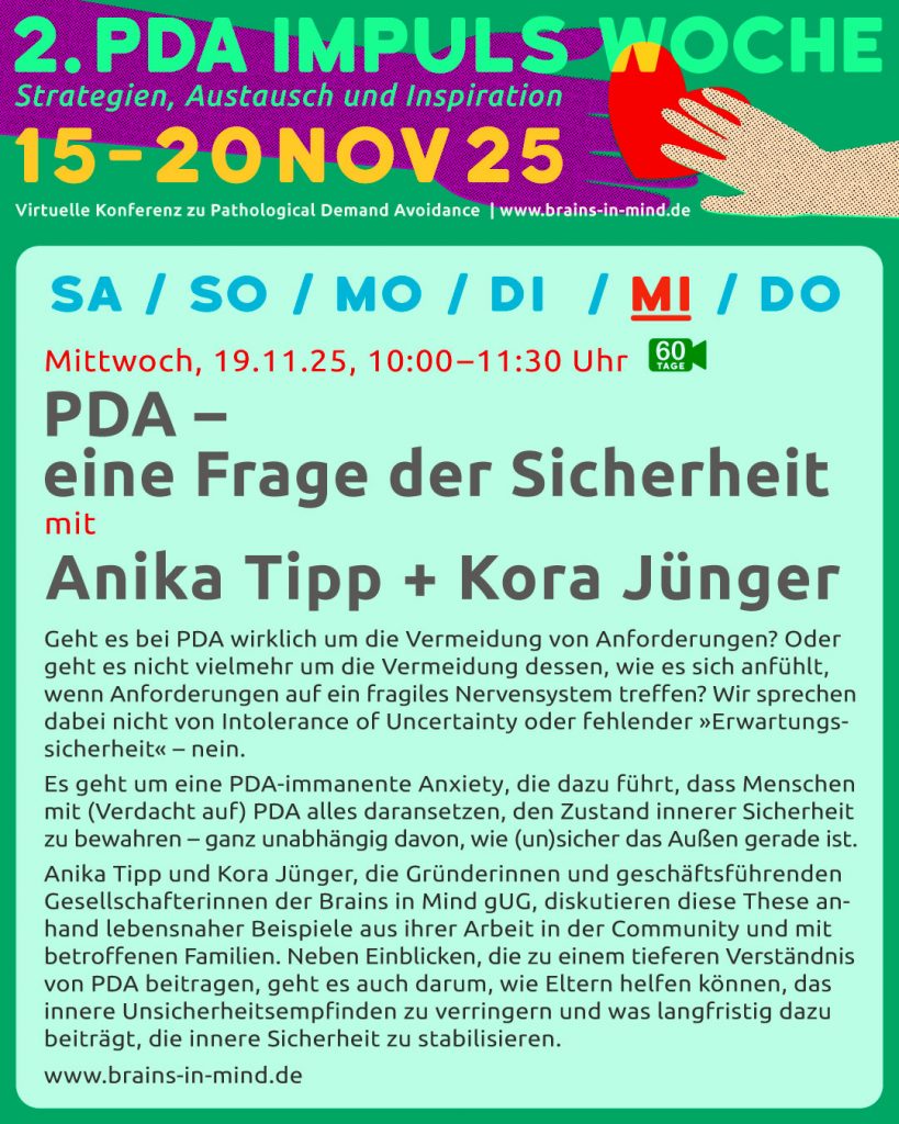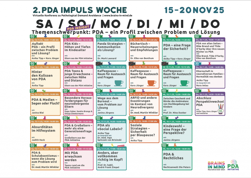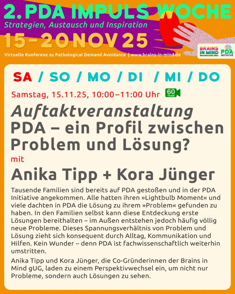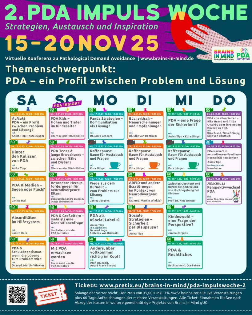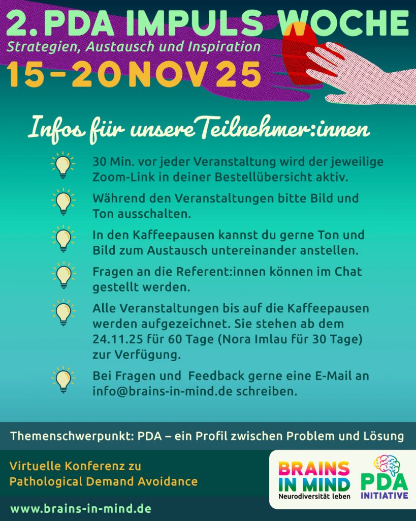 Wichtig: Tickets solange der Vorrat reicht. Der Preis inkludiert alle Veranstaltungen im Rahmen der 2. PDA Impuls Woche plus 60 Tage Aufzeichnungen aller Veranstaltungen außer den Kaffeepausen (Nora Imlau 30 Tage). Die Aufzeichnungen stehen nur Ticketinhaber:innen zur Verfügung. Alle Einnahmen fließen nach Abzug der Kosten in weitere gemeinnützige Projekte von Brains in Mind gUG. Wir bieten Sozialtickets an (Bewerbung bitte an sozialticket@brains-in-mind.de)