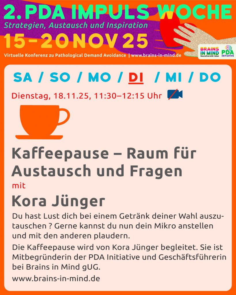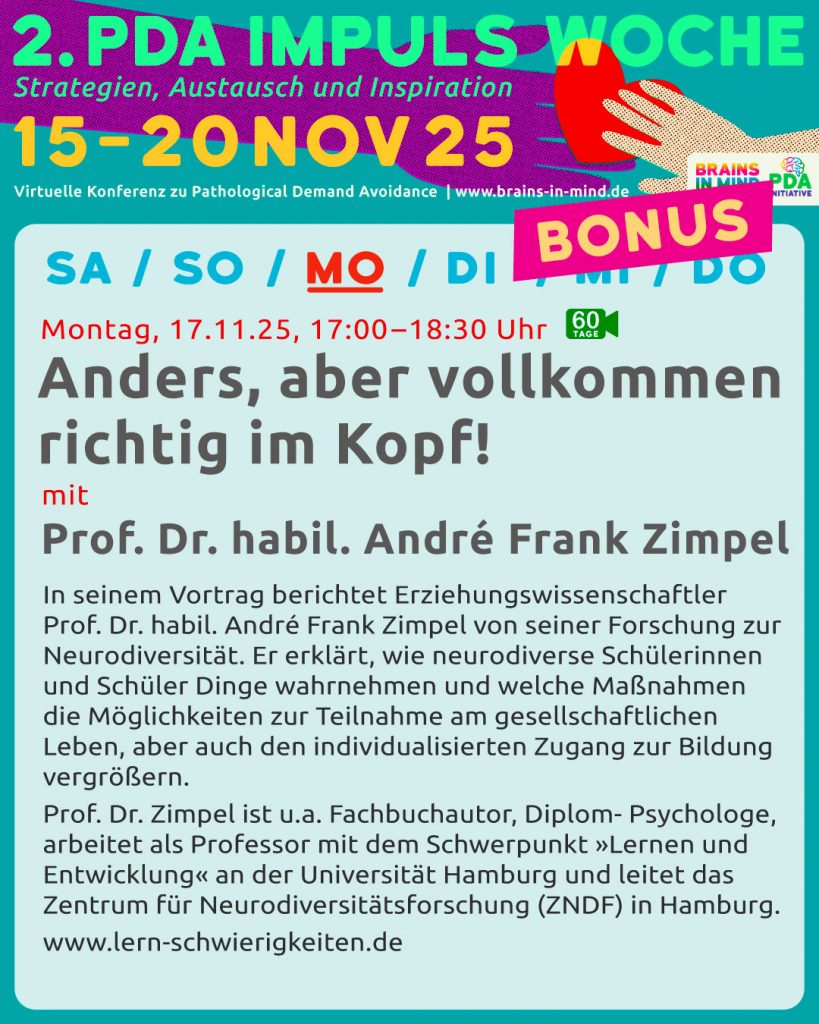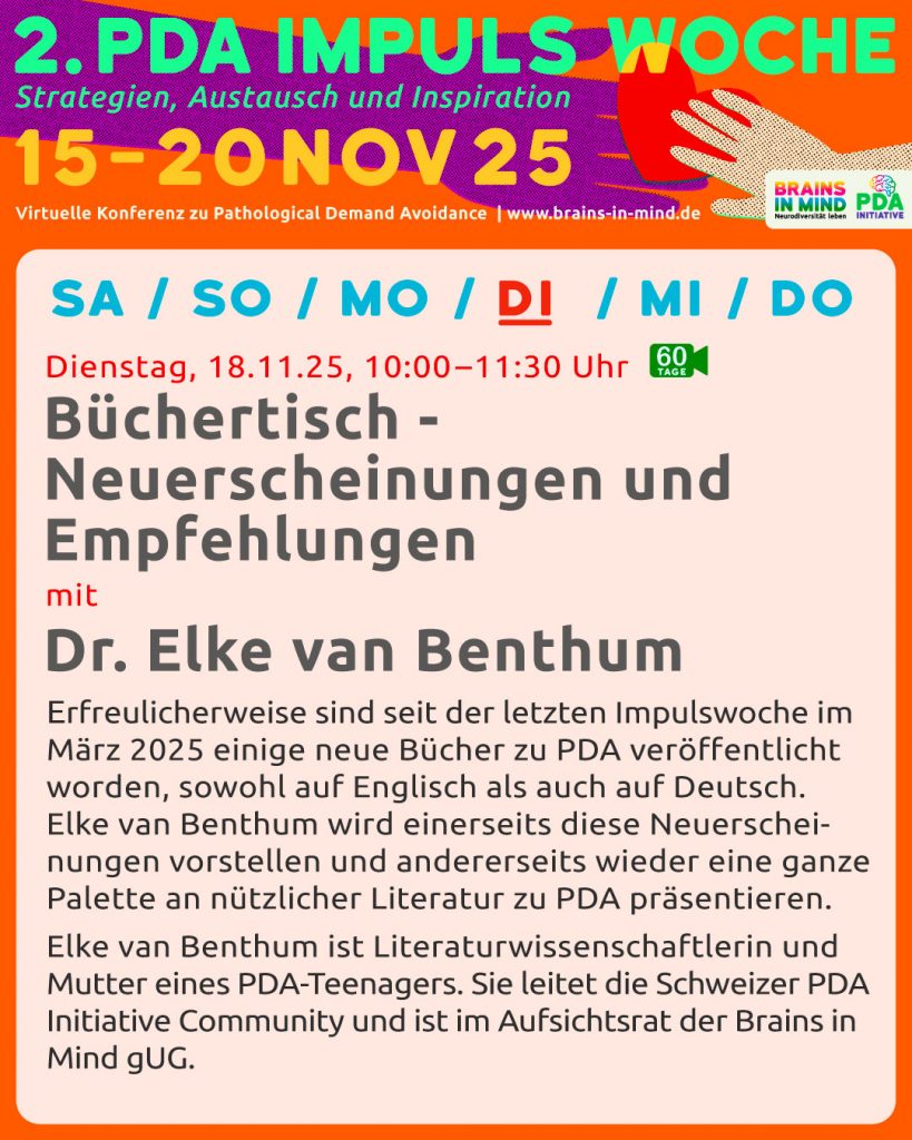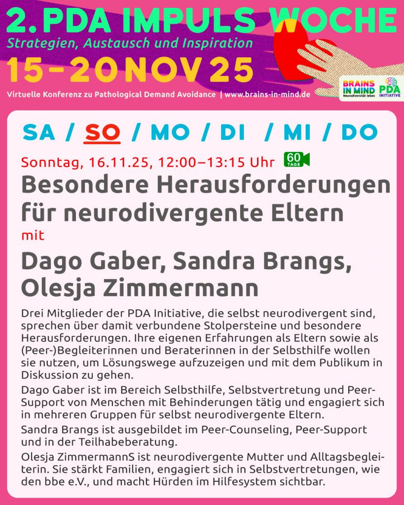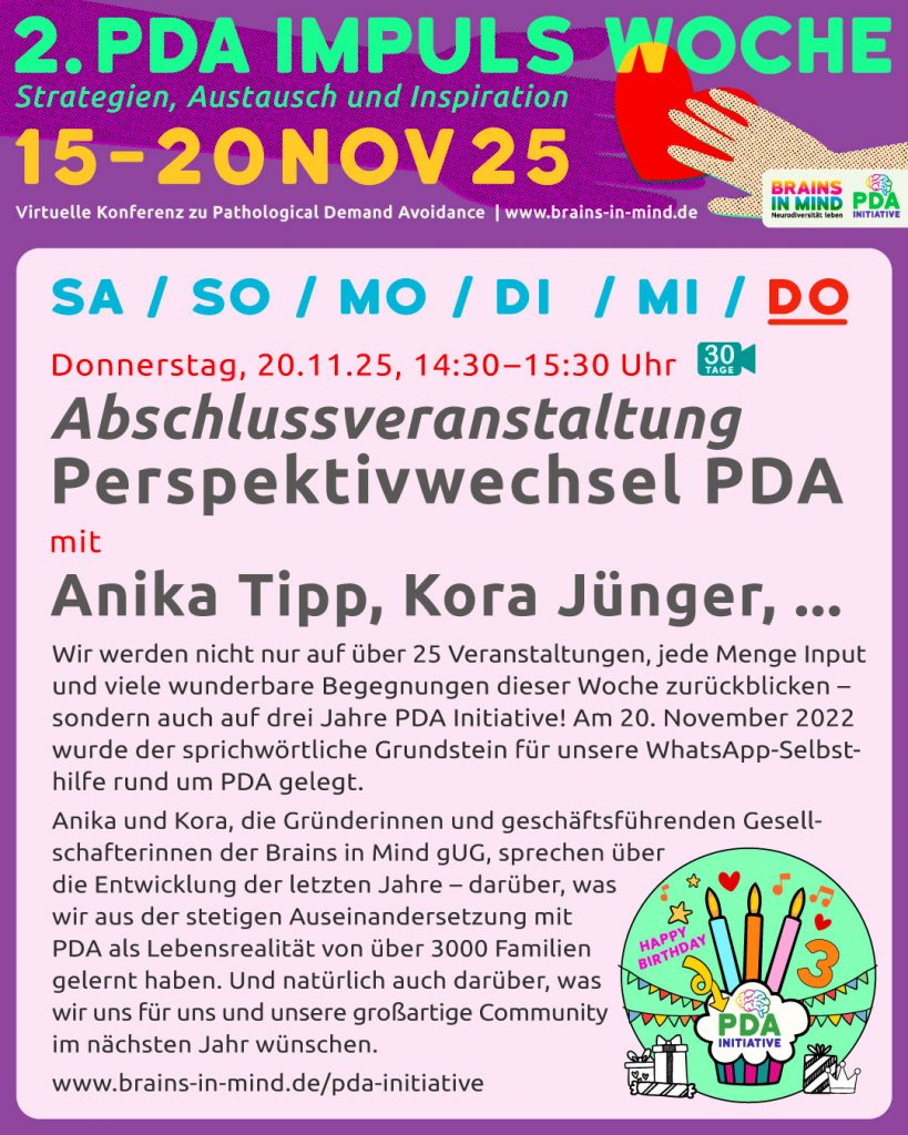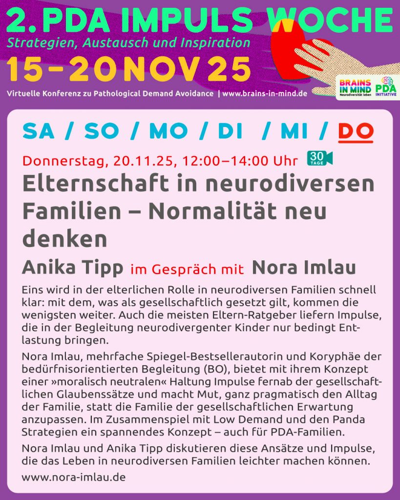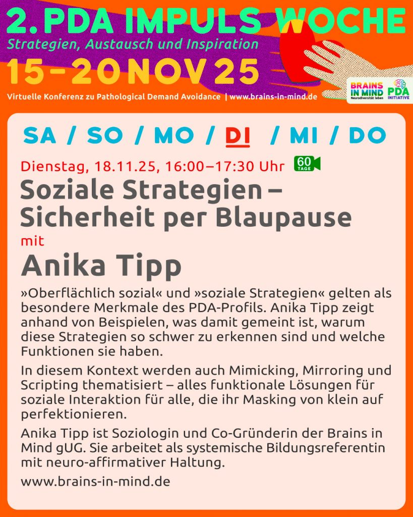 Wichtig: Tickets solange der Vorrat reicht. Der Preis inkludiert alle Veranstaltungen im Rahmen der 2. PDA Impuls Woche plus 60 Tage Aufzeichnungen aller Veranstaltungen außer den Kaffeepausen (Nora Imlau 30 Tage). Die Aufzeichnungen stehen nur Ticketinhaber:innen zur Verfügung. Alle Einnahmen fließen nach Abzug der Kosten in weitere gemeinnützige Projekte von Brains in Mind gUG. Wir bieten Sozialtickets an (Bewerbung bitte an sozialticket@brains-in-mind.de)