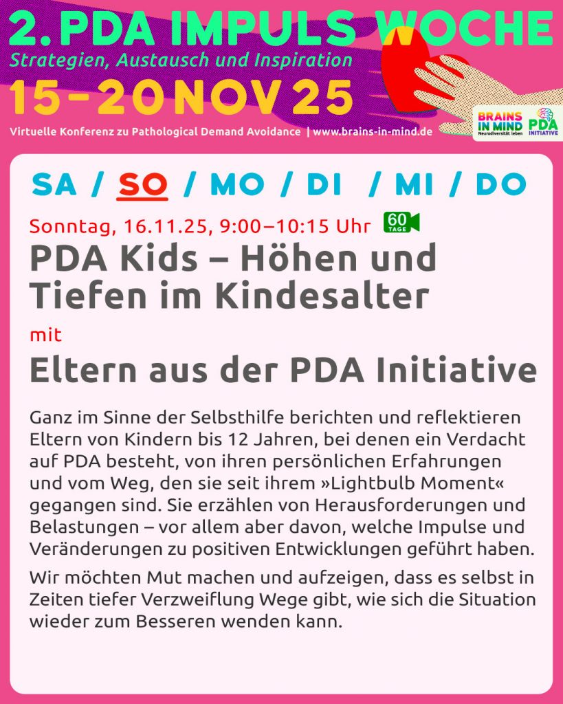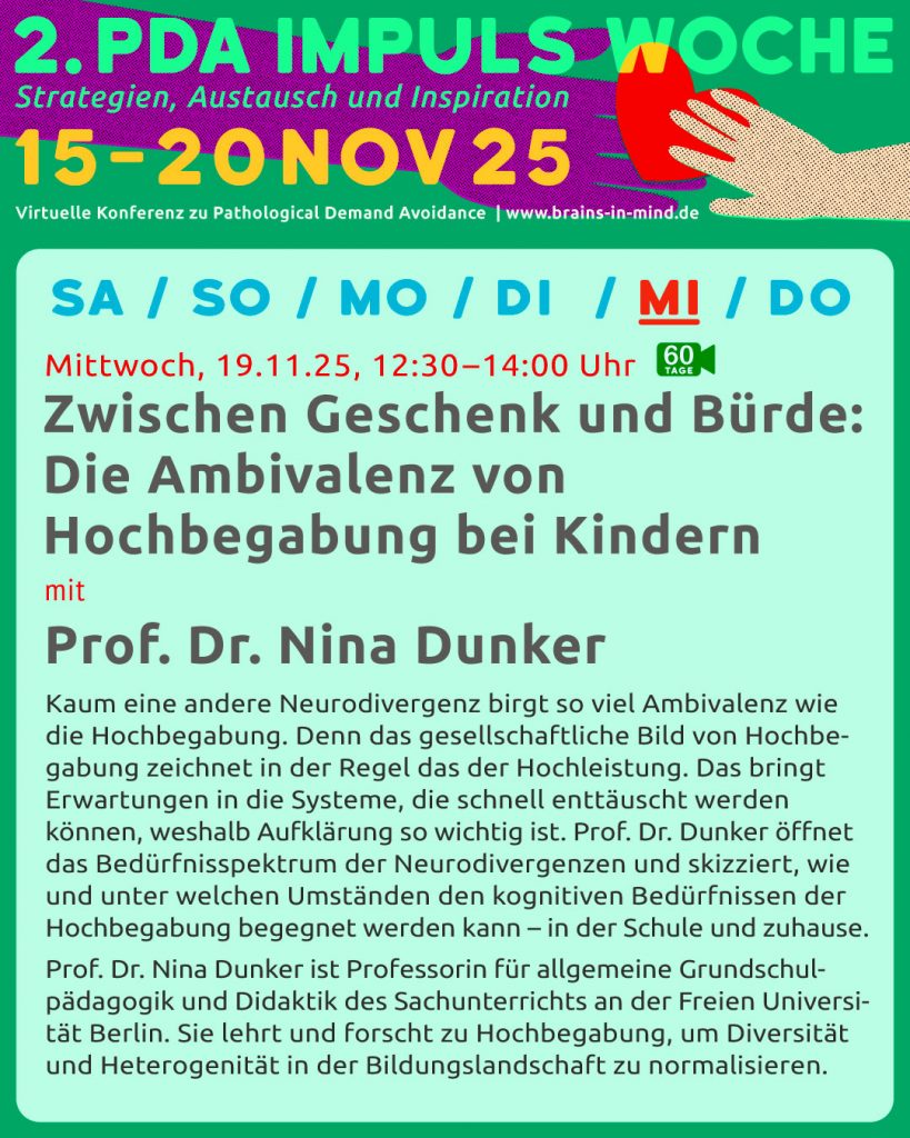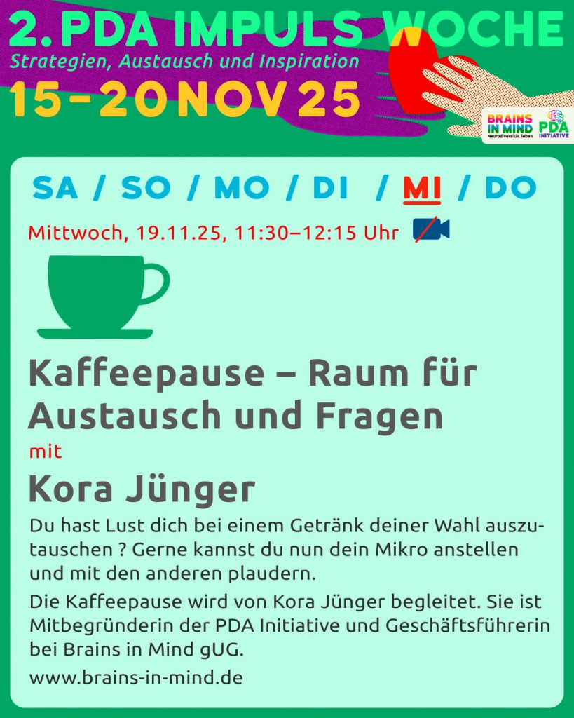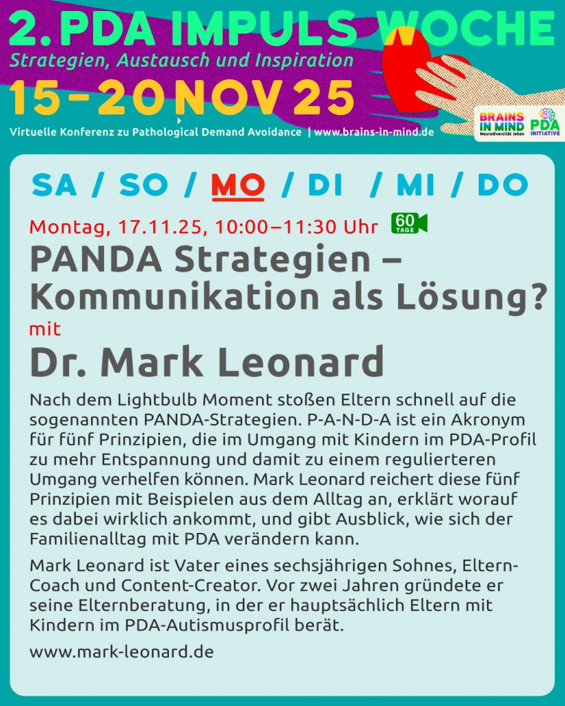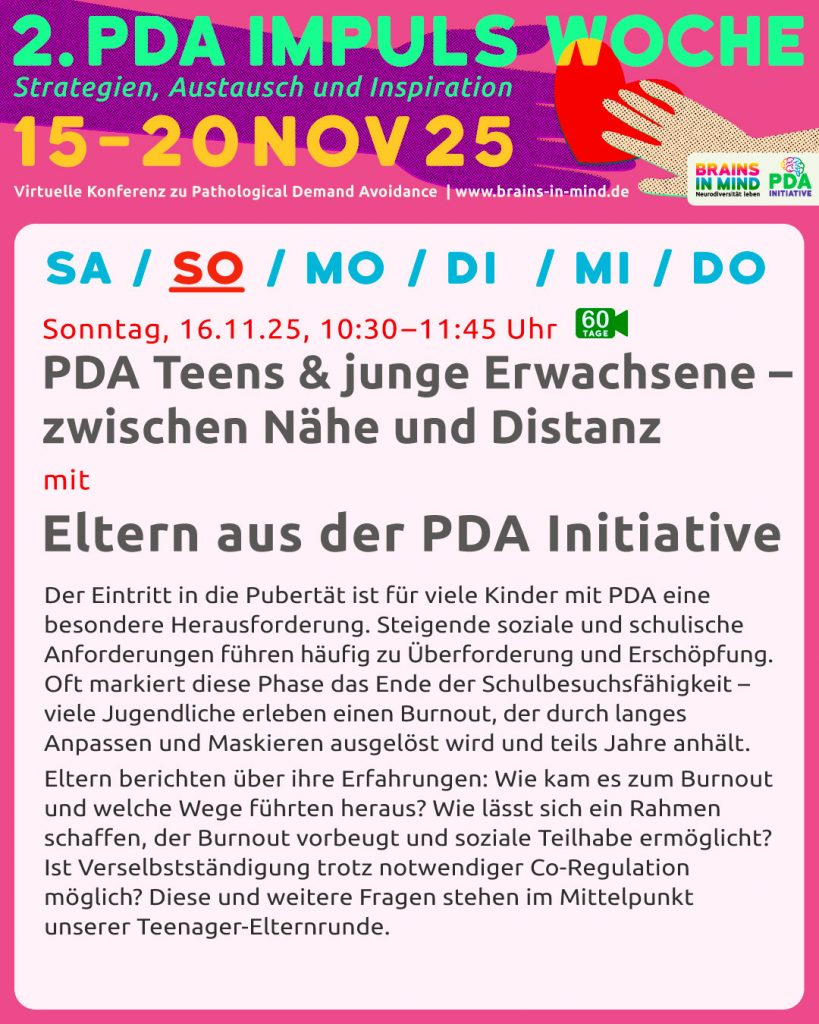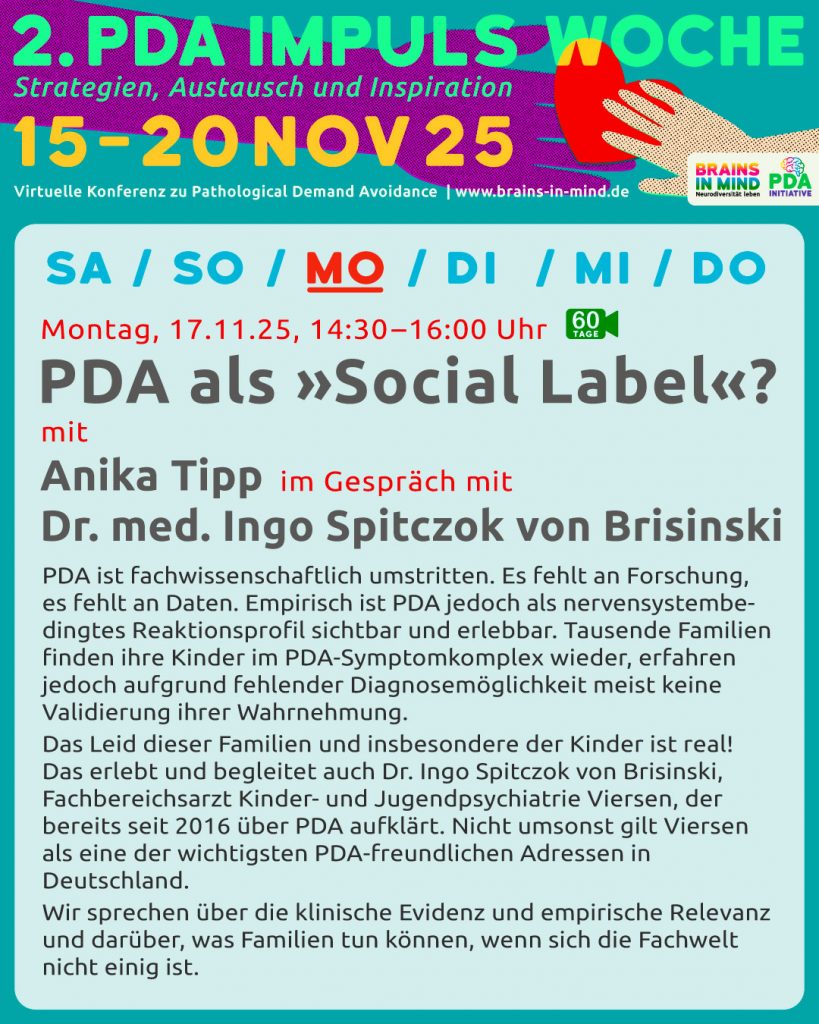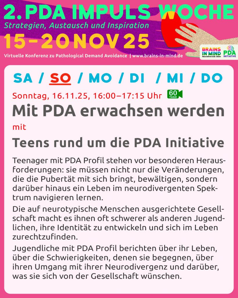 Wichtig: Tickets solange der Vorrat reicht. Der Preis inkludiert alle Veranstaltungen im Rahmen der 2. PDA Impuls Woche plus 60 Tage Aufzeichnungen aller Veranstaltungen außer den Kaffeepausen (Nora Imlau 30 Tage). Die Aufzeichnungen stehen nur Ticketinhaber:innen zur Verfügung. Alle Einnahmen fließen nach Abzug der Kosten in weitere gemeinnützige Projekte von Brains in Mind gUG. Wir bieten Sozialtickets an (Bewerbung bitte an sozialticket@brains-in-mind.de)