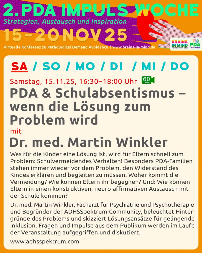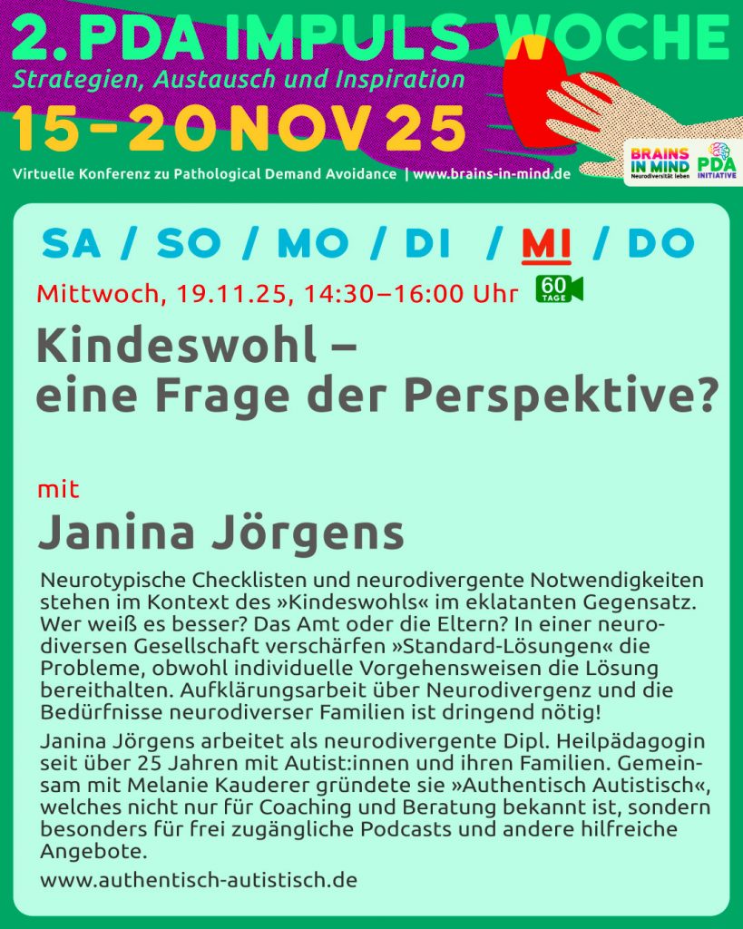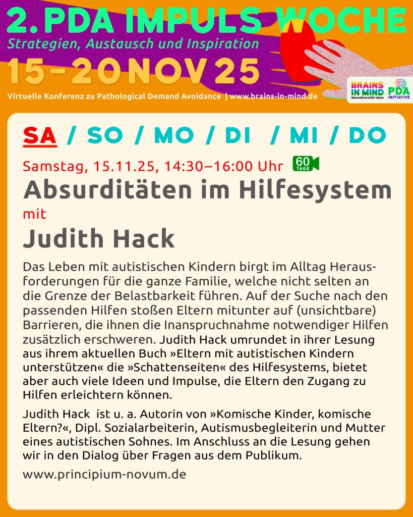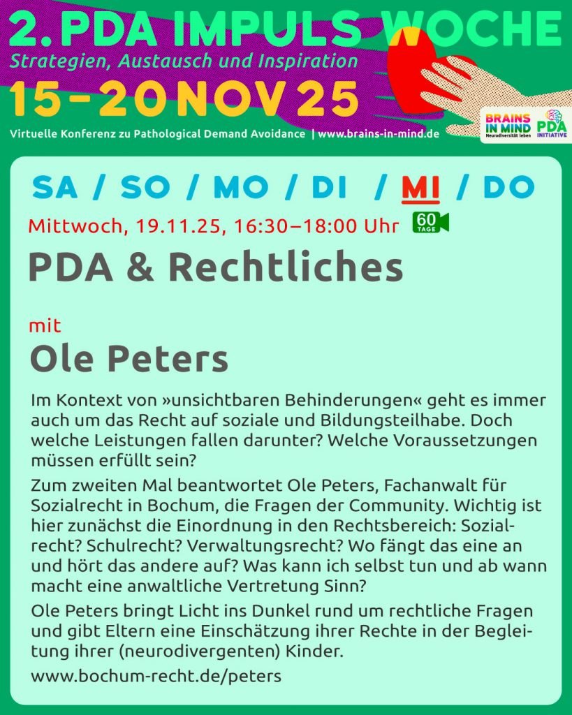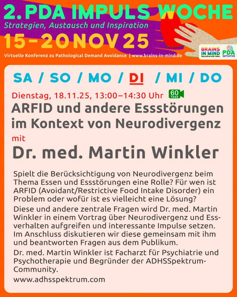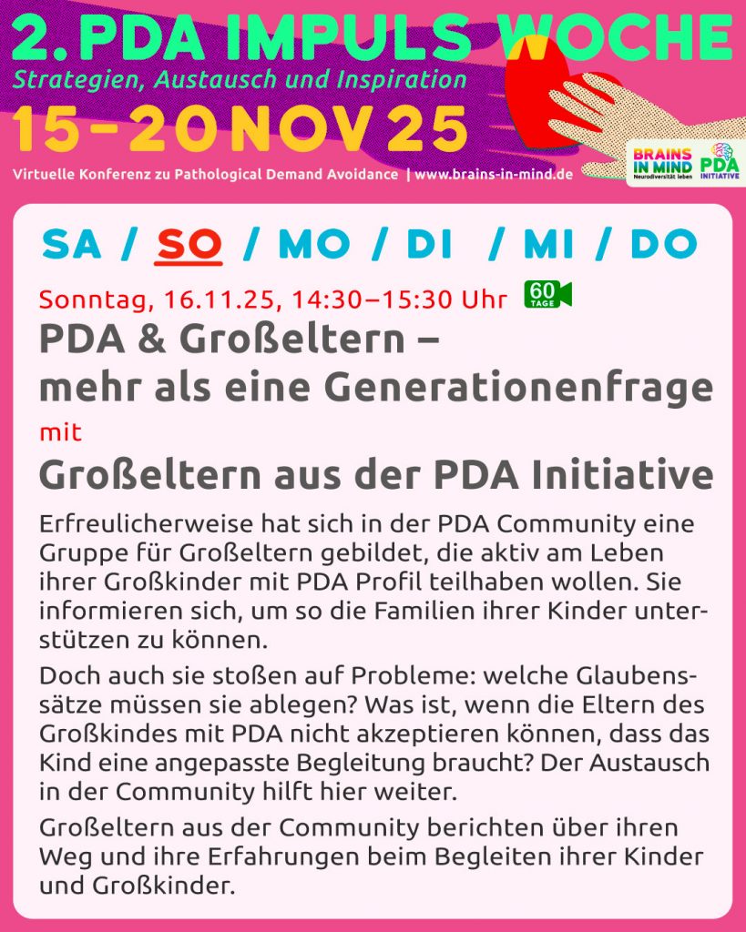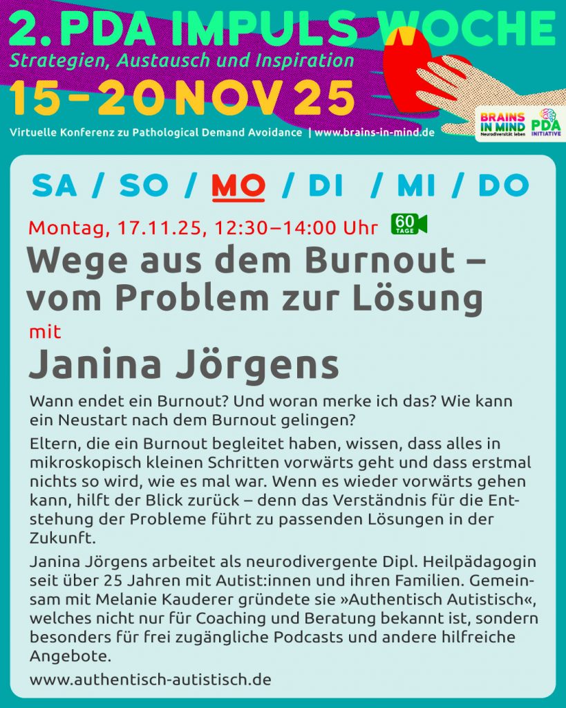 Wichtig: Tickets solange der Vorrat reicht. Der Preis inkludiert alle Veranstaltungen im Rahmen der 2. PDA Impuls Woche plus 60 Tage Aufzeichnungen aller Veranstaltungen außer den Kaffeepausen (Nora Imlau 30 Tage). Die Aufzeichnungen stehen nur Ticketinhaber:innen zur Verfügung. Alle Einnahmen fließen nach Abzug der Kosten in weitere gemeinnützige Projekte von Brains in Mind gUG. Wir bieten Sozialtickets an (Bewerbung bitte an sozialticket@brains-in-mind.de)
