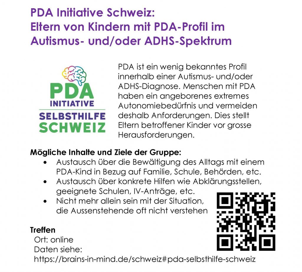 Die PDA Initiative Schweiz bietet eine schweizweite online Selbsthilfegruppe für Eltern von Kindern mit PDA-Profil im Autismus- und/oder ADHS-Spektrum an, die sich zu diversen Themen austauscht. Zudem besteht die Möglichkeit, mit anderen Familien zusammen eine kleinere Austauschgruppe zu bilden.